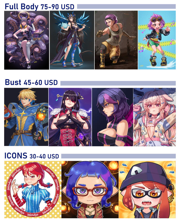 Se enviarán muestras del avance del encargo cada dos o tres días.Cualquier corrección luego de terminar el trabajo requiere un pago adicional.El precio varía dependiendo de la complejidad del personaje, objetos/armas adicionales.